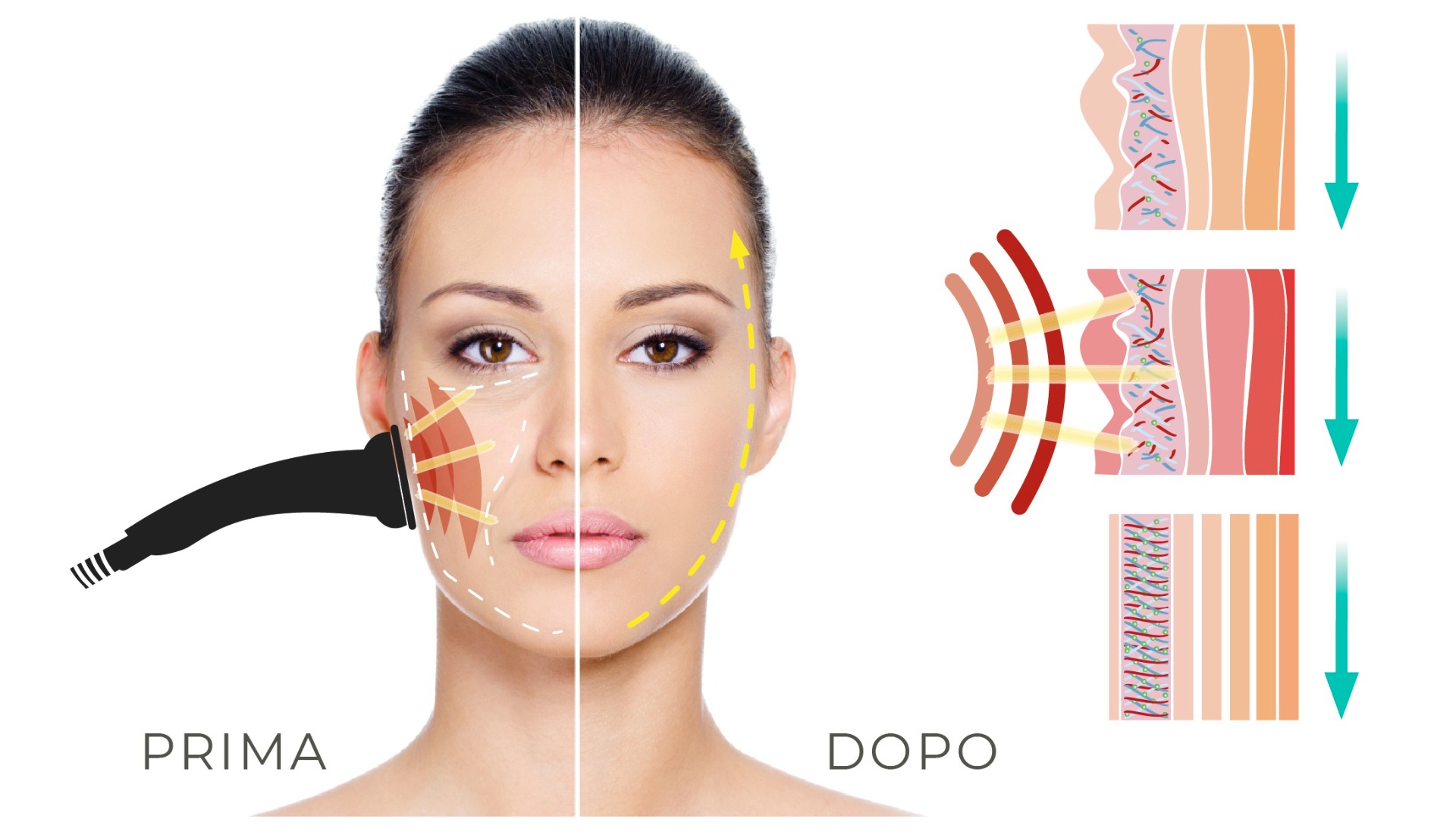 La radiofrequenza si può effettuare sia sul viso sia sul resto del corpo, dal collo all'addome, dal décolleté fino alle gambe. Definita come "lifting senza bisturi", si basa sull'emissione di onde radio del tutto indolori; queste generano calore e, a contatto con la pelle, riescono a stimolare i fibroblasti e la produzione di nuovo collagene, elastina e acido ialuronico da parte dell'epidermide.